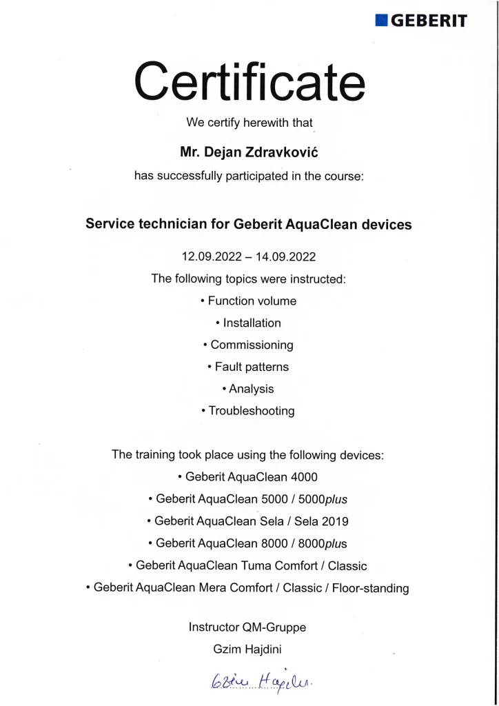 Sertifikat ovlašćenog Geberit servisera za AquaClean