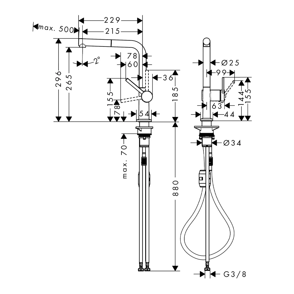 Hansgrohe Talis M54 270 baterija za sudoperu sa tušem, matt black. Crevo za tuširanje koji se može zaključati, crevo se vraća pritiskom na preusmerivač prskanja i automatski se vraća kroz zatvaranje ručke.